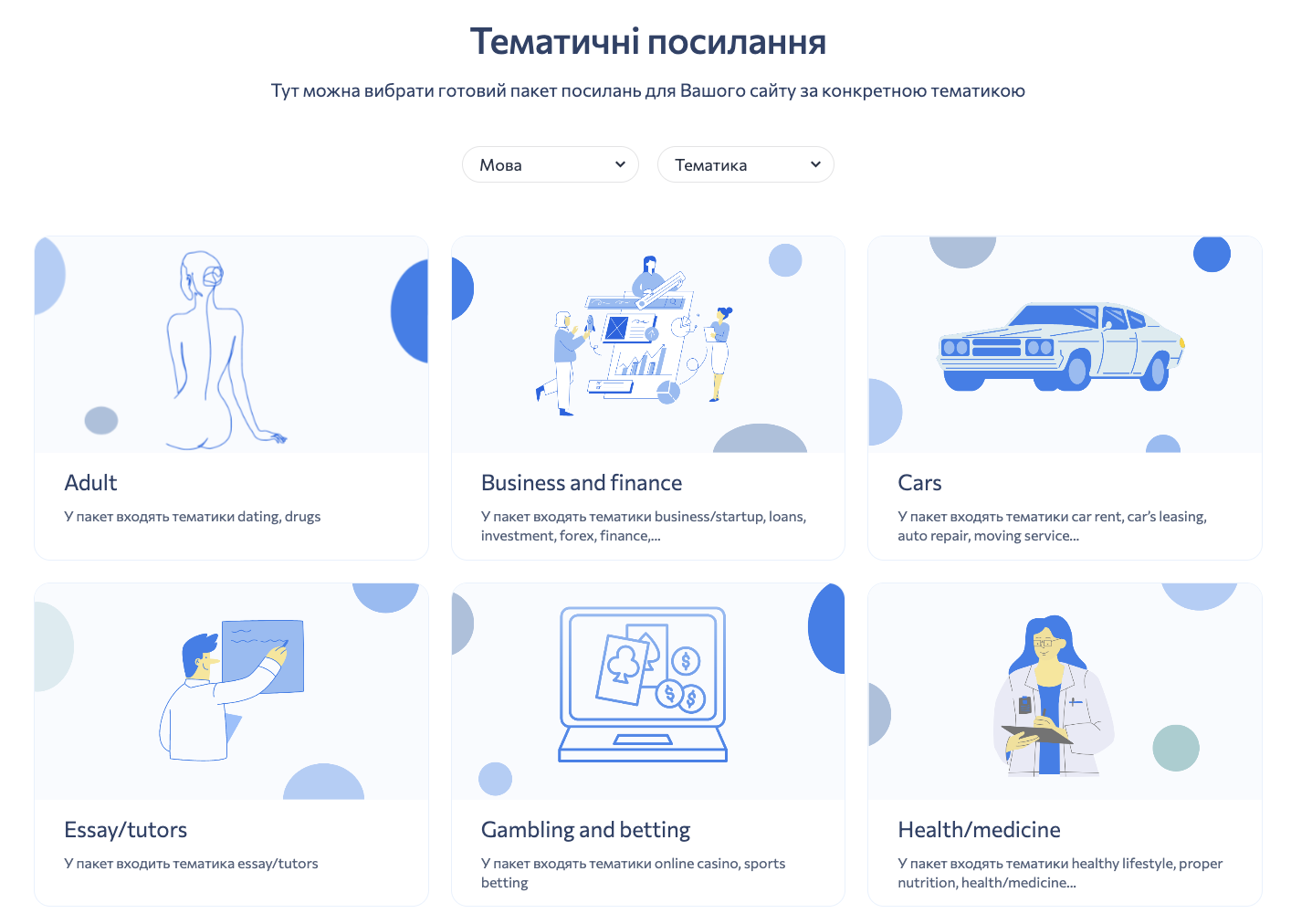 Сервіс пропонує широкий спектр посилань, підібраних під кожну конкретну тематику. Представлені варіанти включають різноманітні типи посилань, щоб задовольнити потреби різних проектів.