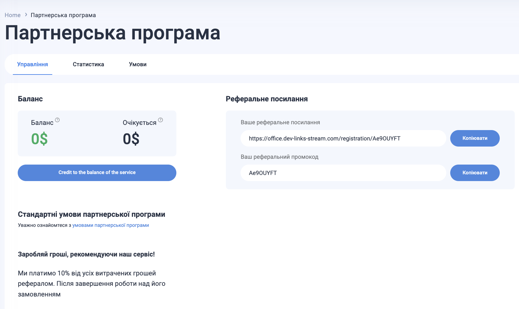 Партнер може скористатися реферальним посиланням або промокодом, отримуючи 10% винагороди з кожної вдало завершеної угоди на свій партнерський баланс.