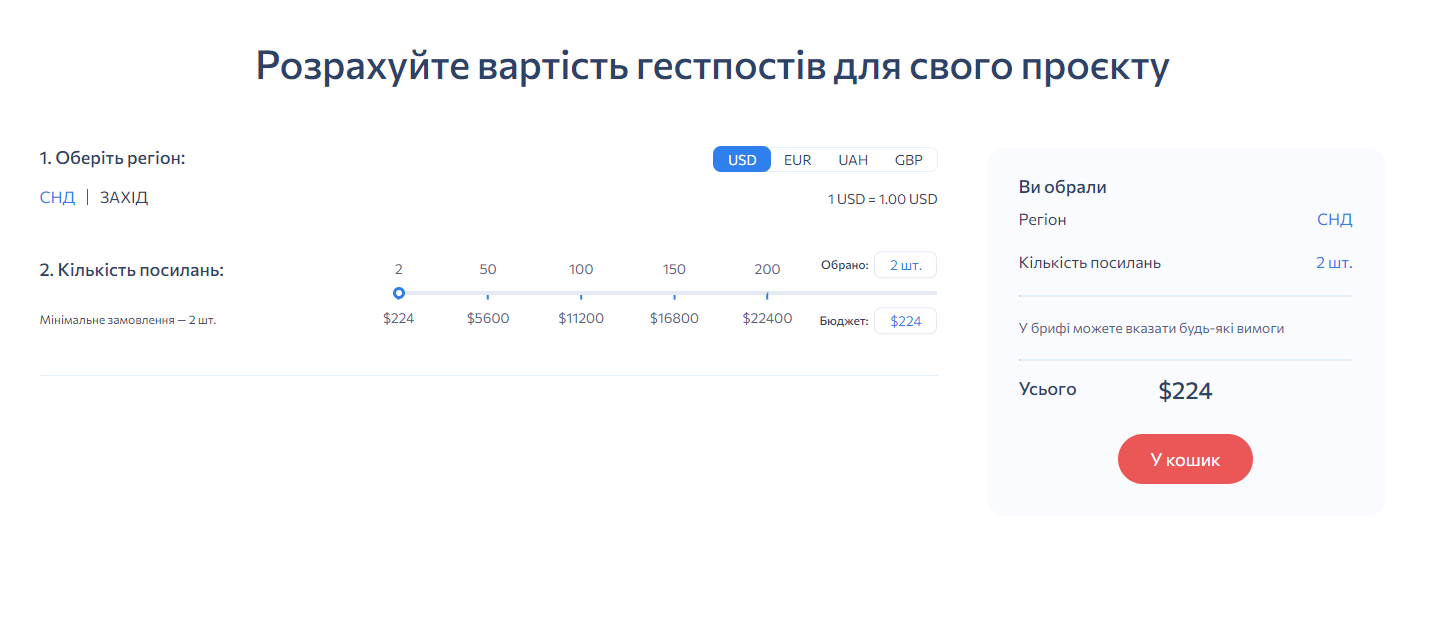Для визначення вартості послуги ви можете скористатися зручним калькулятором. Процес простий і зрозумілий: спочатку виберіть регіон вашого сайту, потім вкажіть бажану валюту для оплати. Далі визначте необхідну кількість і тип посилань відповідно до ваших вимог. Після внесення всіх параметрів калькулятор виведе на екран загальну вартість замовлення.