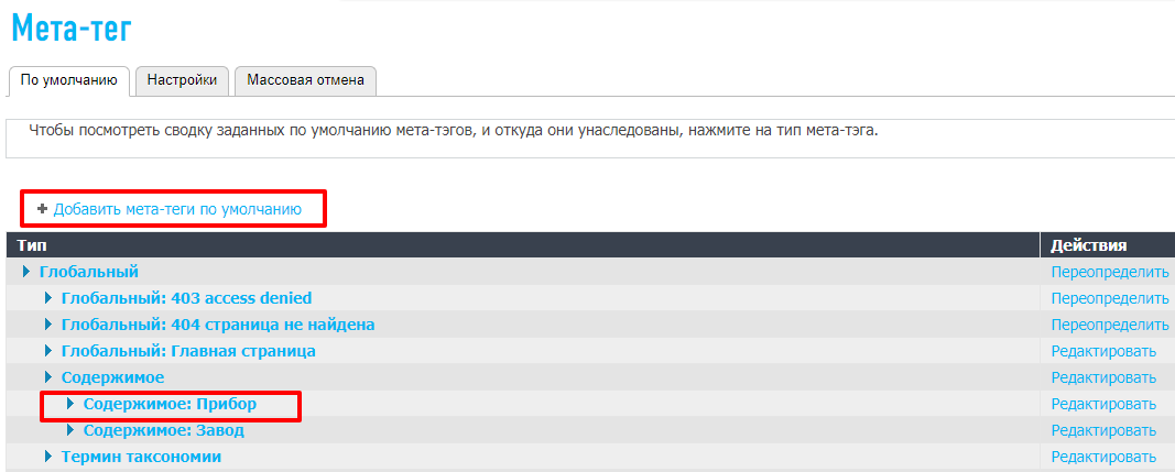 - Переходим в настройки метатегов admin/config/search/metatags и добавляем (если еще не добавлены) тип метатегов (admin/config/search/metatags/config/add) В нашем случае тип шаблона метатегов уже был ранее создан как: Содержимое: прибор