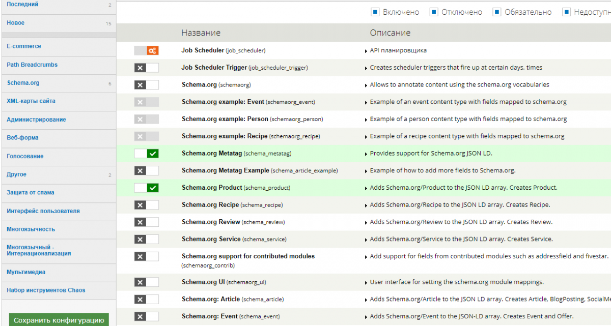 И так, устанавливаем модули, и теперь включаем. В модуле Schema.org metatag включаем те подмодули, которые нам нужны. Каждый подмодуль отвечает за отдельный вид контента. Например: