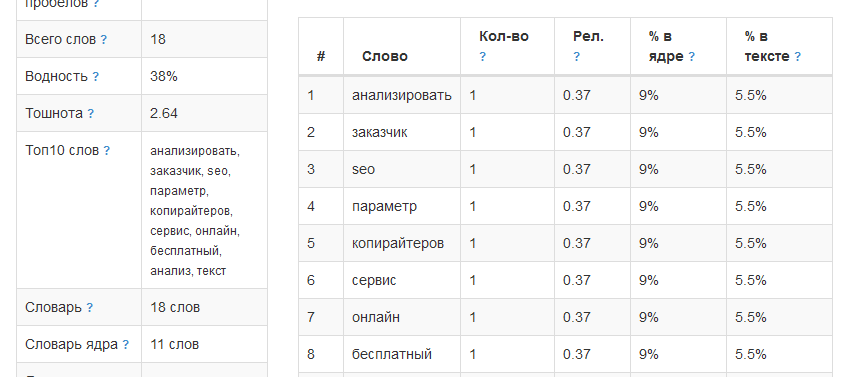 Из всех показанных нам данных, самые важные на которые мы обращаем внимание - это "Тошнота" и "Водность" в левой колонке отчета, и в таблице со словами на столбцы "Слово" и "Релевантность".