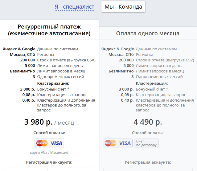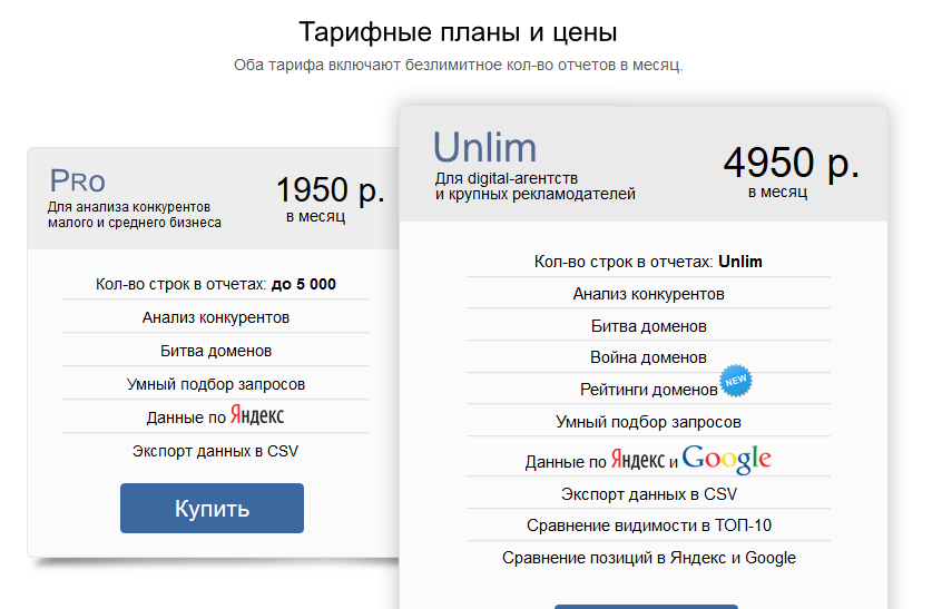 Сервис справился быстро, показатели наглядные, поэтому для оптимизаторов московского региона Spywords удобен в использовании. Тарифы по инструменту разбиты на две категории — для рядовых специалистов и крупного бизнеса.