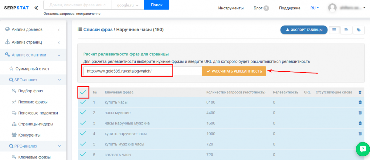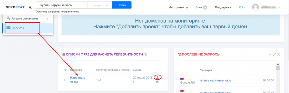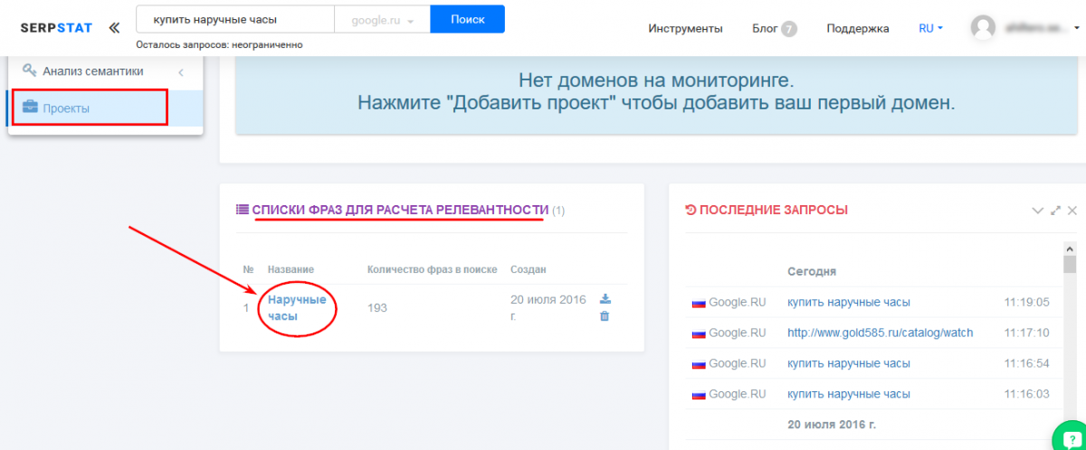 Теперь проводим проверку с помощью Serpstat. Когда список слов собран (как мы описывали выше), переходим в раздел “Проекты”, и кликаем по названию нашего списка ключей о наручным часам.