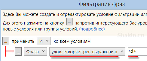 Загружаем найденные в этих сервисах ключевые фразы в Key Collector, в колонке “Фраза” нажимаем кнопку “Редактировать условия фильтрации”, и выбираем в выпадающем меню “Удовлетворяет регулярному выражению”.