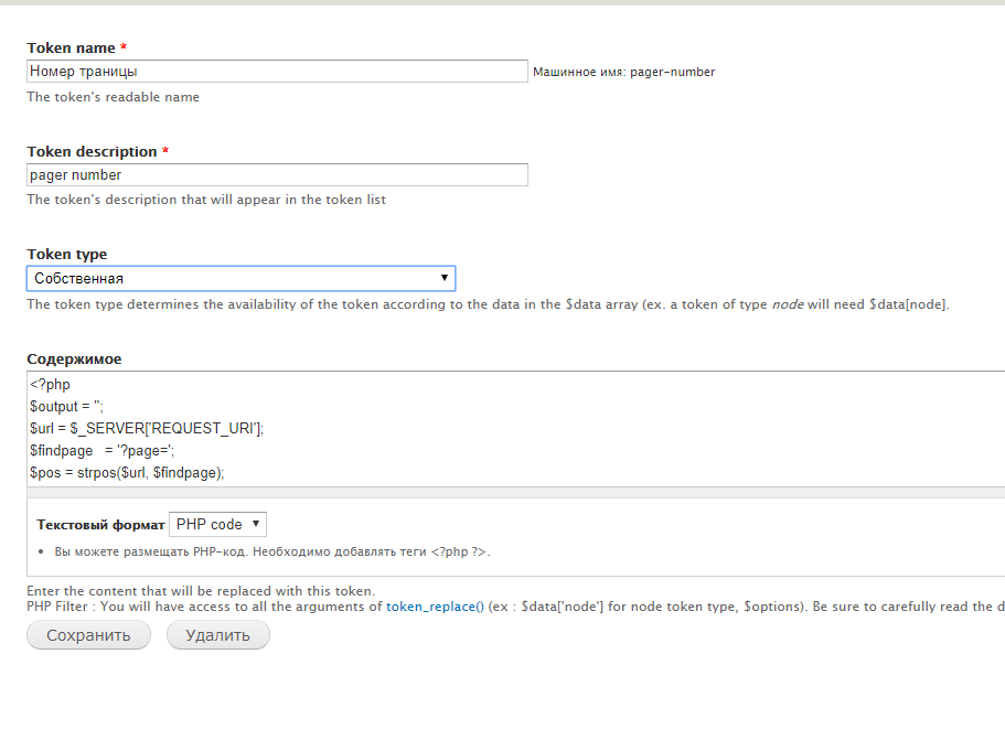 Устанавливаем все, и с помощью модуля Custom Token создаем собственный токен, который будет отвечать за вывод номера страниц в тегах Title и Description для того, чтобы они не считались дублями. Итак, переходим к созданию токена (admin/structure/token-custom/add) и вставляем примерно следующий код: