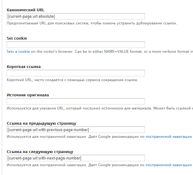 - В поле "Канонический URL" вставляем токен ["current-page:url:absolute"]